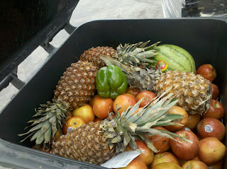 Recently I was able to take a look into one of these bins and found them to be as expected, produce items that were in bad shape, but not all of them. The pineapples looked like they had seen better days, the melons looked ok but I was only interested in the green pepper and the apples. I grabbed my canvas bag out of my car and tossed in a few Braeburn apples and the green pepper and speed walked to my car so I didn't get into trouble. I was on their property even though they had tossed the food out. This trash bin was full and about a 55 gallon size. I wanted to call up some Freegans to swoop over and take what they took so the food wouldn't go to waste. And I did try. I looked through Meetup.com for freegans and tried emailing a lady on the site but got no response. Unfortunately, there isn't a regional or city contact for freegans to get the word out on food that is tossed out unless you know someone directly from already being part of the group.