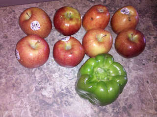 If you didn't know these came from the trash and you pulled them out of the crisper looking like this (pock marks on the apples and bruising on the top of the green pepper as well). Would you have continued to cook and eat them?